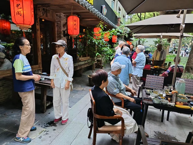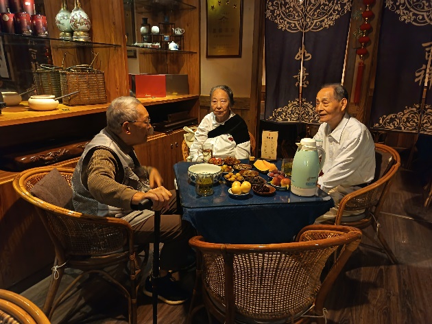 茶话会现场气氛热烈,情谊融融。老友们久别重逢,分外亲切,大家围坐在一起,品着清茶,畅叙旧情,闲话家常,欢声笑语不绝于耳。他们中既有年过九旬、精神矍铄的李海青老师,也有专程从国外归来、正巧在杭的吕勇哉老师。难得的相聚时光,让每一位老师脸上都洋溢着喜悦与激动。大家共同回忆往昔岁月,分享退休生活的点滴乐趣,也互道珍重,表达诚挚的祝福。