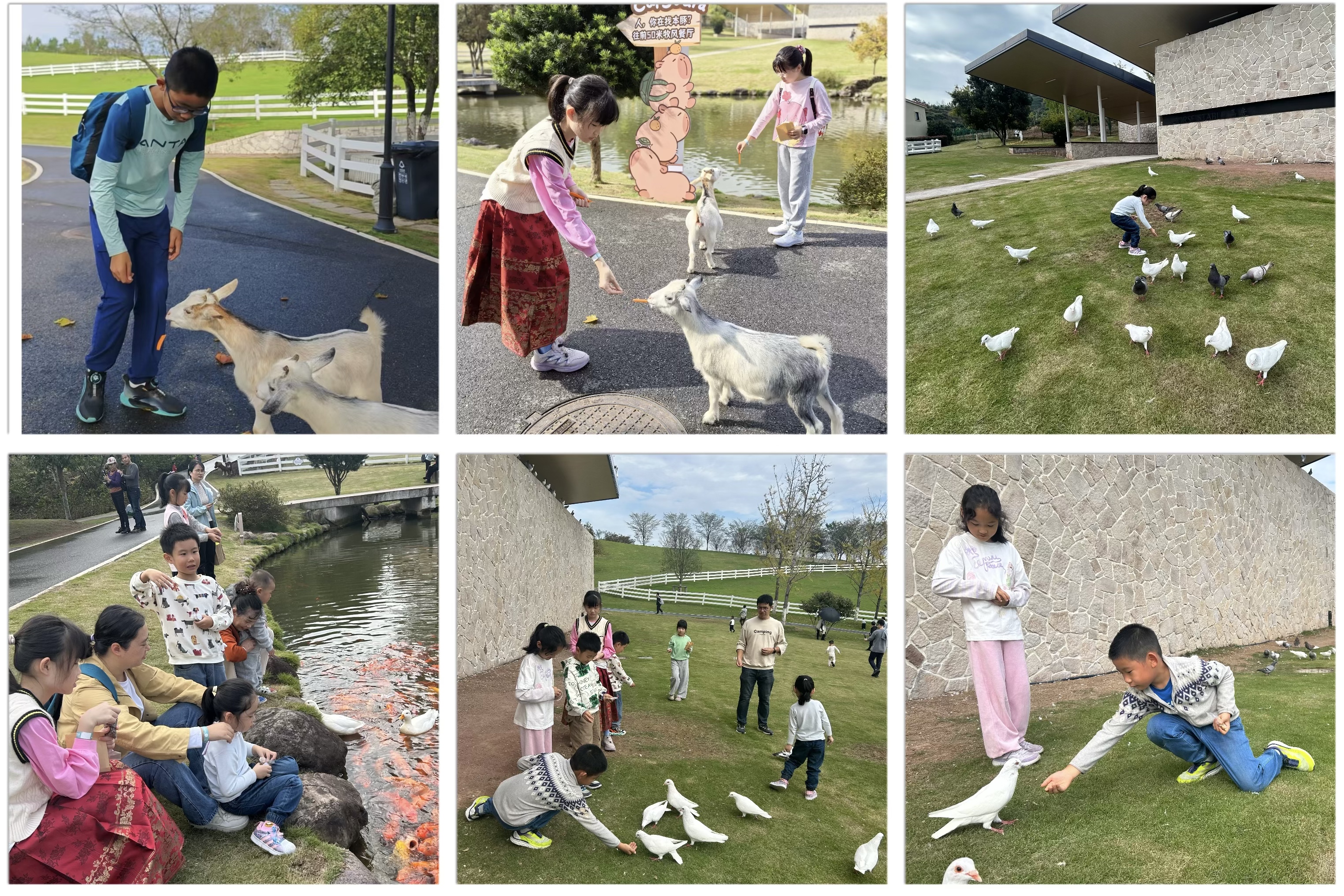 次日,教职工们前往花田美地生态园区,开启秋日赏花之旅。百亩花田内,蛇鞭菊、醉蝶花、柳叶马鞭草等花卉竞相绽放,色彩斑斓的花海如同铺展在大地上的绚丽画卷。大家漫步花径,赏秋景、谈工作、聊生活,不时用相机记录下眼前的美景与同行的欢乐瞬间。园区内的朵朵牧场成为孩子们的欢乐天地。小朋友们兴奋地与温顺的小动物互动,亲手投喂小羊、小鱼和鸽子,清脆的笑声与欢快的脚步声响彻田野,尽情释放童真活力。