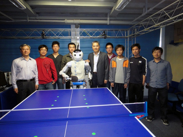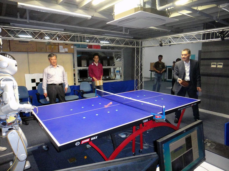 随后,金书记观看了仿人机器人“悟”与实验室学生对打乒乓球的现场演示。看到机器人灵活自如地挥拍击球,从容不迫地与对方“切磋”球艺,金书记高兴地指出,这个演示有利于提高大众对机器人技术的关注和兴趣,有利于创造良好的机器人技术发展氛围,很值得适时大力宣传。之后,金书记还拿起球拍,饶有兴致地亲自上阵一展球技,引起在场人员阵阵欢笑和掌声。