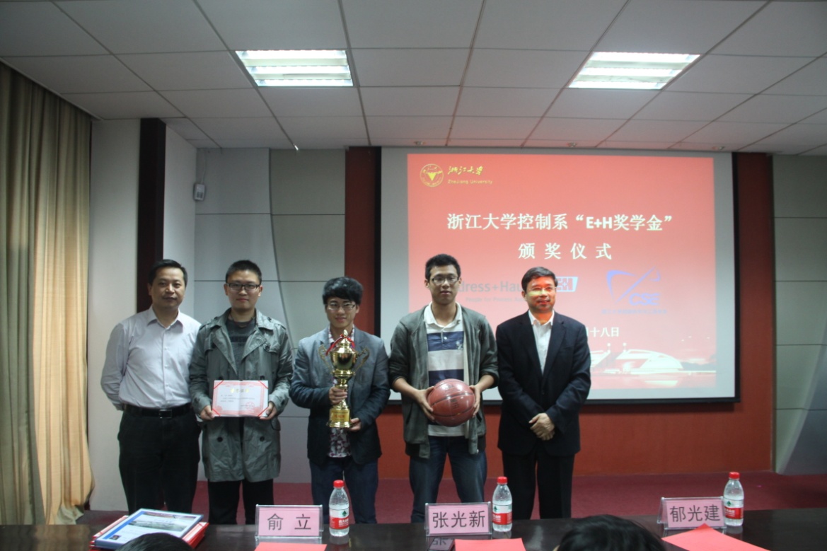 随后举行了控制系第三届“E+H杯”篮球赛颁奖仪式。由在场的嘉宾共同为在篮球赛中取得优异成绩的集体和个人颁奖。其中冠军为1102班和1103班研究生联队,亚军为研究生1105班和博士班联队,季军为本科生0802班和0805班联队,姚建江同学获得最有价值球员称号。接着举行了控制系“E+H”奖学金颁奖仪式。余明钊、鲁天龙、宋博雅、张璐四名本科生,肖冬峰、沈进昌、蒋华琴、李元实、丁阳、徐超六名研究生凭借一年来优异的综合表现获得了这一殊荣。张璐同学代表获奖学生发言,她对给予他们支持和帮助的上海E+H公司和学校的各位老师表示感谢,表示自己要继续努力学习,要带着一颗感恩的心取得更大的进步,以后更好地为社会贡献自己的力量。