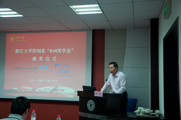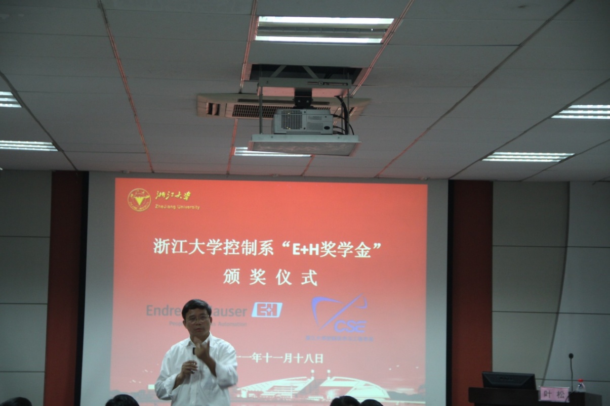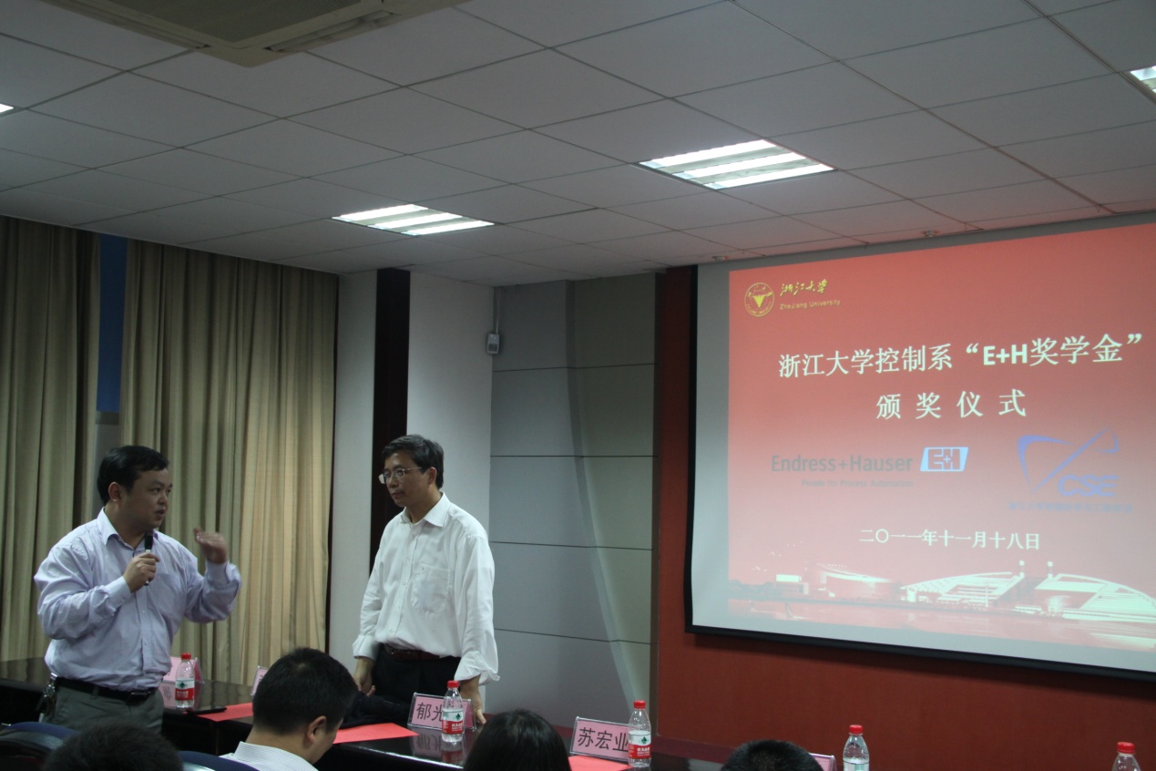11月18日下午,浙江大学控制系“E+H奖学金”颁奖仪式在浙江大学玉泉校区隆重举行。上海E+H公司总经理郁光建博士、人事部经理姚悦女士、应用专家张伟先生、销售工程师俞立先生、控制系主任苏宏业教授、副主任张光新教授、党委副书记叶松老师、团委书记丁立仲老师、团委副书记季湘铭老师出席了颁奖仪式。系党委副书记叶松老师主持了仪式。