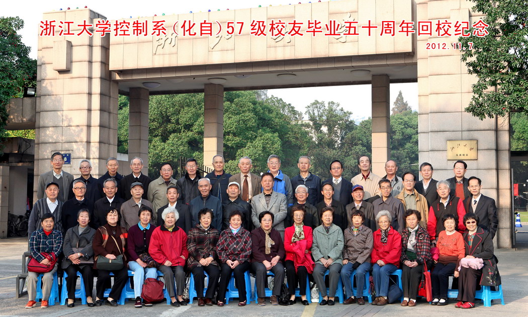 2012年11月7日,控制系(化自)57级的40多位校友在毕业五十周年之际同返求是园,再叙同窗情谊。“悠悠岁月五秩秋,漫漫人生风雨稠。两鬓微霜初染白,笑看夕阳数风流。”弹指一挥间已是五十年,昔日风华正茂的莘莘学子,如今大多是两鬓霜白的古稀老人,重逢执手,感慨峥嵘,回顾人生,其情真切。