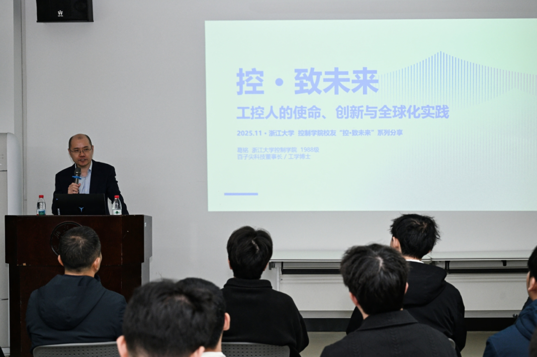 为深化校友联结、发挥榜样引领作用,搭建在校生与行业精英的交流平台,11月7日,浙江大学控制科学与工程学院第三期“控·致未来”校友导航人生活动在玉泉校区工控新楼123报告厅顺利举行。活动特邀学院1988届校友、杭州百子尖科技股份有限公司董事长葛铭博士返校,围绕“技术与产业融合、AI赋能中国智造、青年工科生的全球创新路径”等主题展开分享。控制学院党委副书记詹美燕及2025级新生生涯委员等50余名师生共同参与,活动由2025年孙优贤奖学金获得者、新入职学科博士后楼嗣威老师主持。